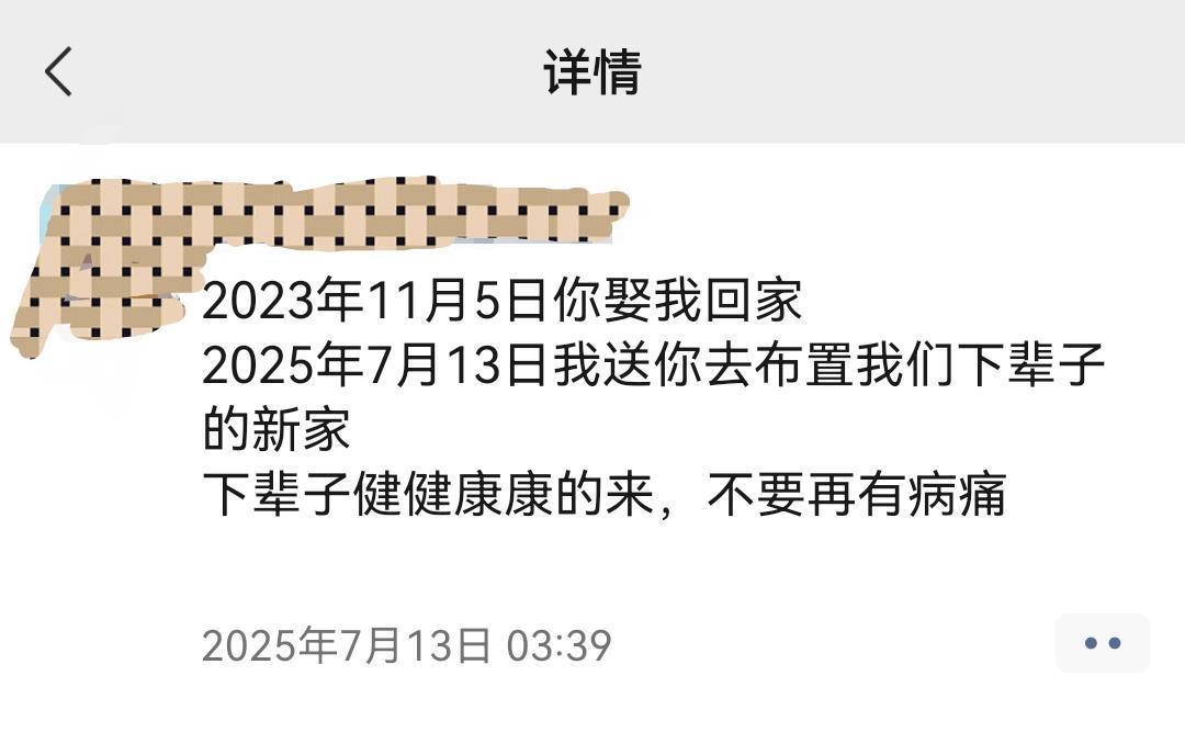 7月13日,鹿女士發布訃告,告別深愛的丈夫:“2023年11月5日你娶我回家,2025年7月13日我送你去布置我們下輩子的新家。下輩子健健康康的來,不要再有病痛。”