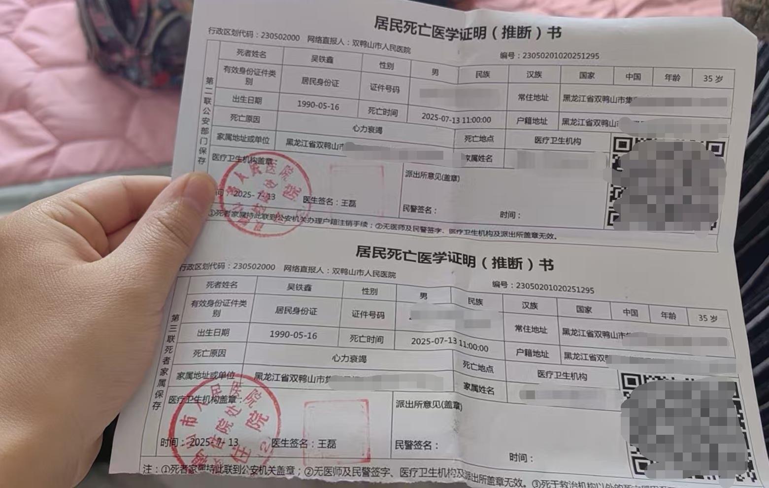 今年6月中旬以來,黑龍江等地出現持續高溫天氣。其妻子鹿女士表示,丈夫由此患上了熱射病。7月13日上午11時,因糖尿病引起的多癥狀并發癥,以及心臟衰竭,吳鐵鑫不幸離世。