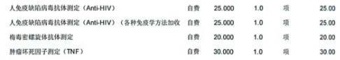 記者在患者費用清單上看到,檢查中包含了“人免疫缺陷病毒抗體測定(Anti-HIV)、梅毒密螺旋體抗體測定、腫瘤壞死因子測定(TNF)”,這幾項化驗的費用約100元。