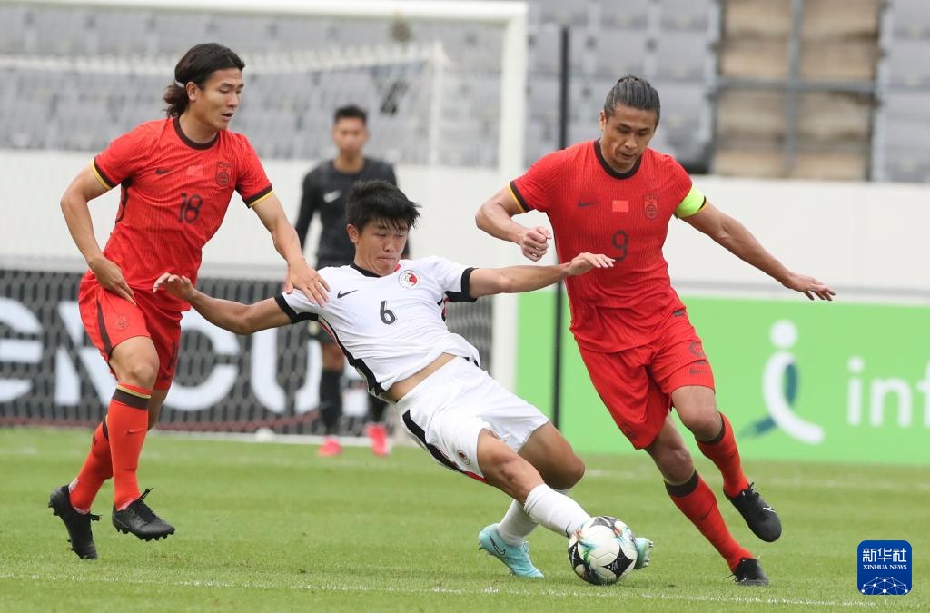7月15日,中國隊球員張玉寧(右)、廖錦濤(左)與中國香港隊球員陳俊樂(中)在比賽中拼搶。新華社記者 姚琪琳 攝