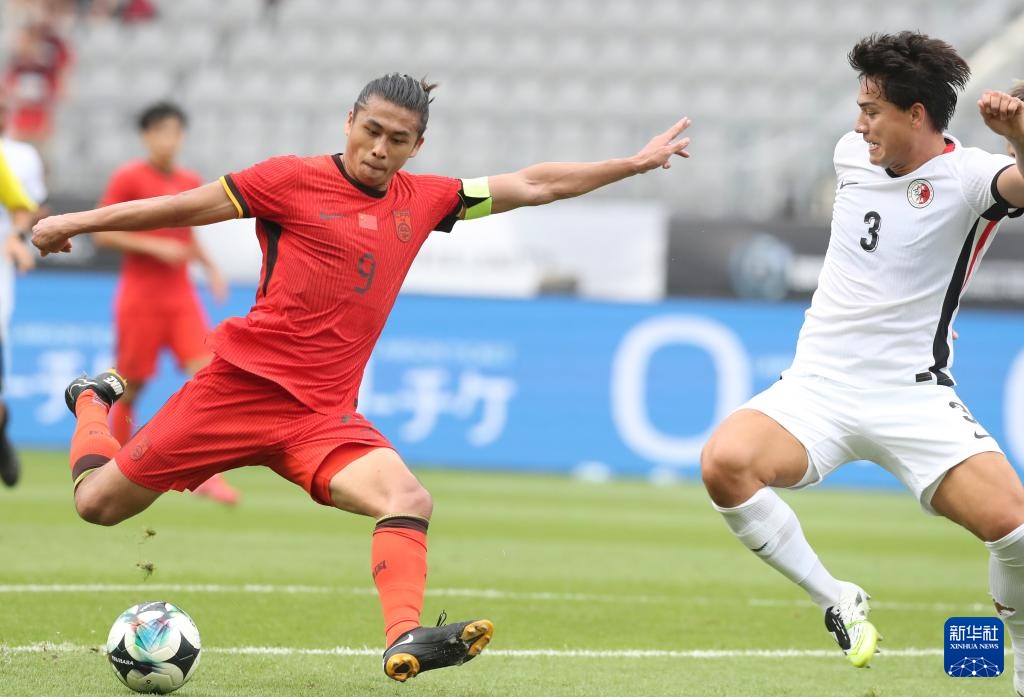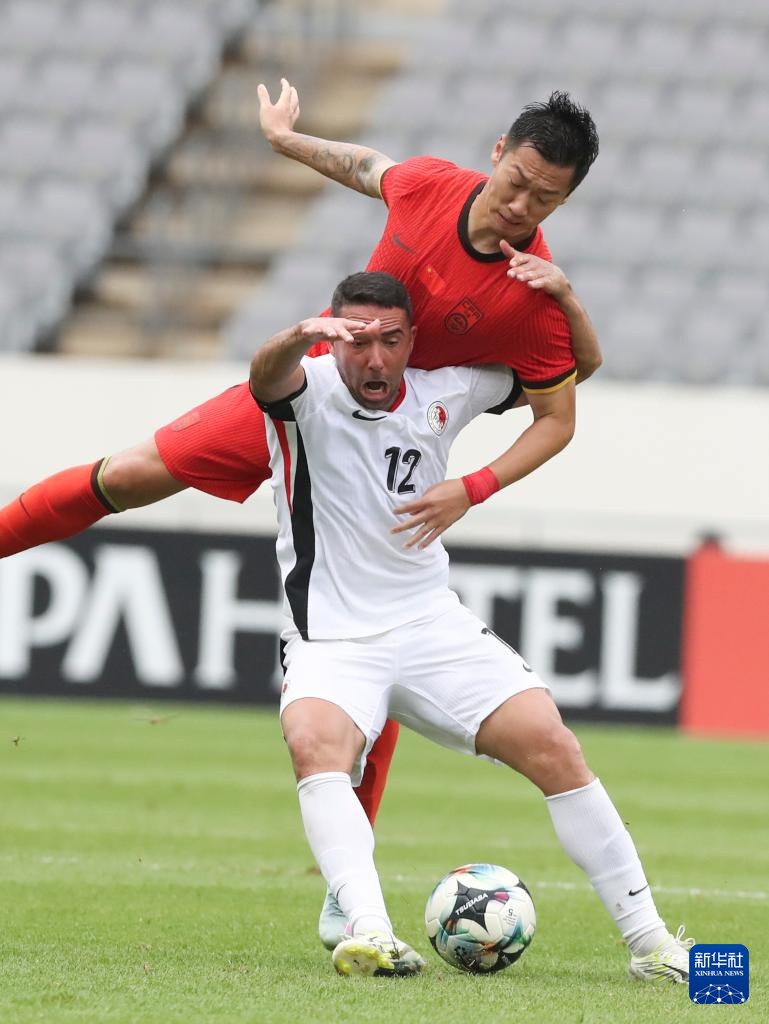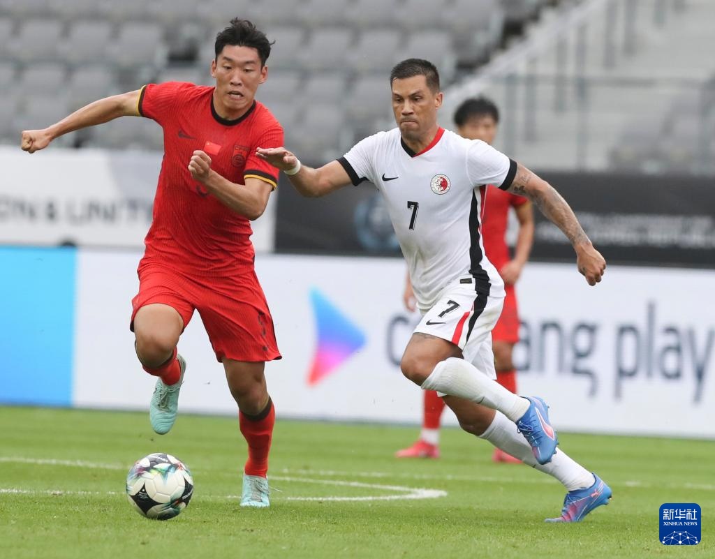 7月15日,中國隊球員吾米提江·玉蘇普(左)在比賽中防守中國香港隊球員安永佳。新華社記者 姚琪琳 攝