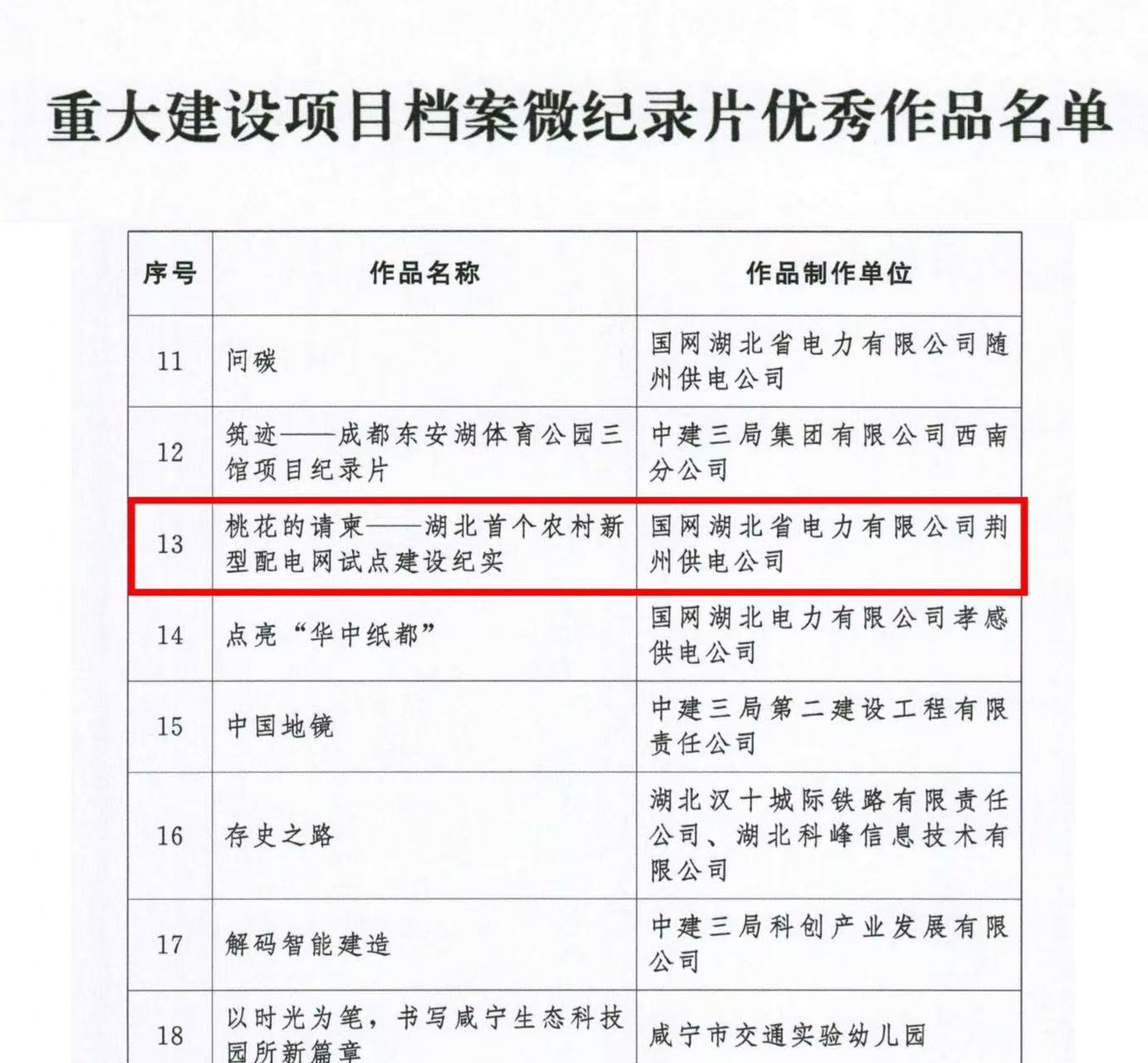 荊楚網(湖北日報網)訊(通訊員 袁艷子、秦玲)近日,國網荊州供電公司辦公室創作的微紀錄片《桃花的請柬——湖北首個農村新型配電網試點建設紀實》,在全省重大建設項目檔案微紀錄片征集活動中脫穎而出,榮獲優秀作品。