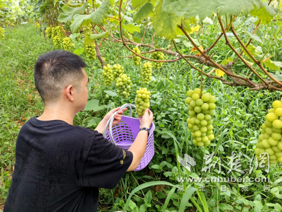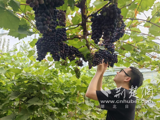 荊楚網(湖北日報網)訊(通訊員 肖朕天 王哲)7月15日,走進京山市新市街道四嶺村,這里的葡萄迎來豐收季,一串串成熟的葡萄綴滿枝頭,吸引眾多游客前來體驗采摘樂趣。