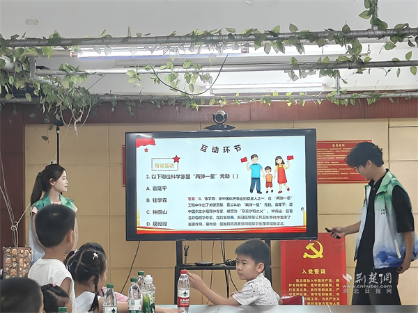 7月16日,讀書社區(qū)新時代文明實踐站里,湖北經(jīng)濟學(xué)院工商管理學(xué)院“核”光同塵志愿宣講團帶來“兩彈一星”精神宣講。宣講團成員運用豐富的影像資料,講述了錢學(xué)森、鄧稼先等老一輩科學(xué)家在建國初期毅然放棄國外優(yōu)渥條件,沖破重重阻力回到祖國,克服科研困境最終鑄就“兩彈一星”輝煌的感人故事。“科學(xué)詞匯傳聲筒”互動游戲環(huán)節(jié),孩子們在傳遞“原子彈”“衛(wèi)星”等詞匯的過程中,既學(xué)習(xí)了科學(xué)知識,更感悟到了科技工作者的愛國情懷。
