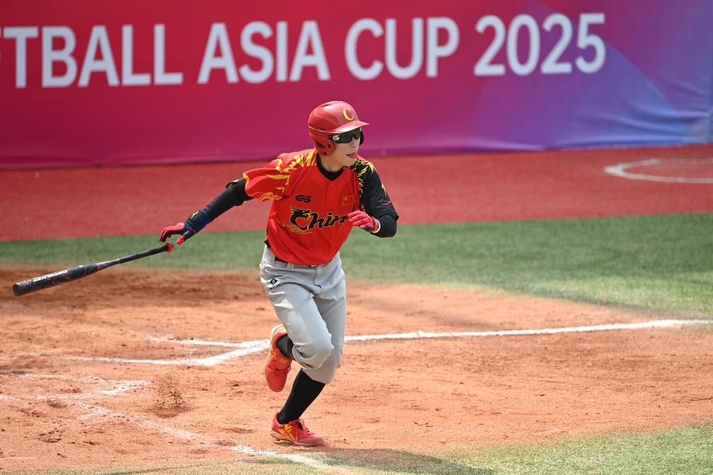 7月16日,中國隊球員任敏在擊球后跑壘。新華社記者鄒競一攝