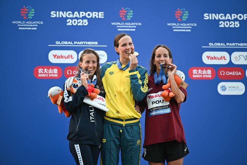 7月16日,冠軍澳大利亞選手約翰遜(中)、亞軍意大利選手塔代烏奇(左)、季軍摩納哥選手麗莎·波(右)在頒獎儀式上合影。新華社記者 薛宇舸 攝