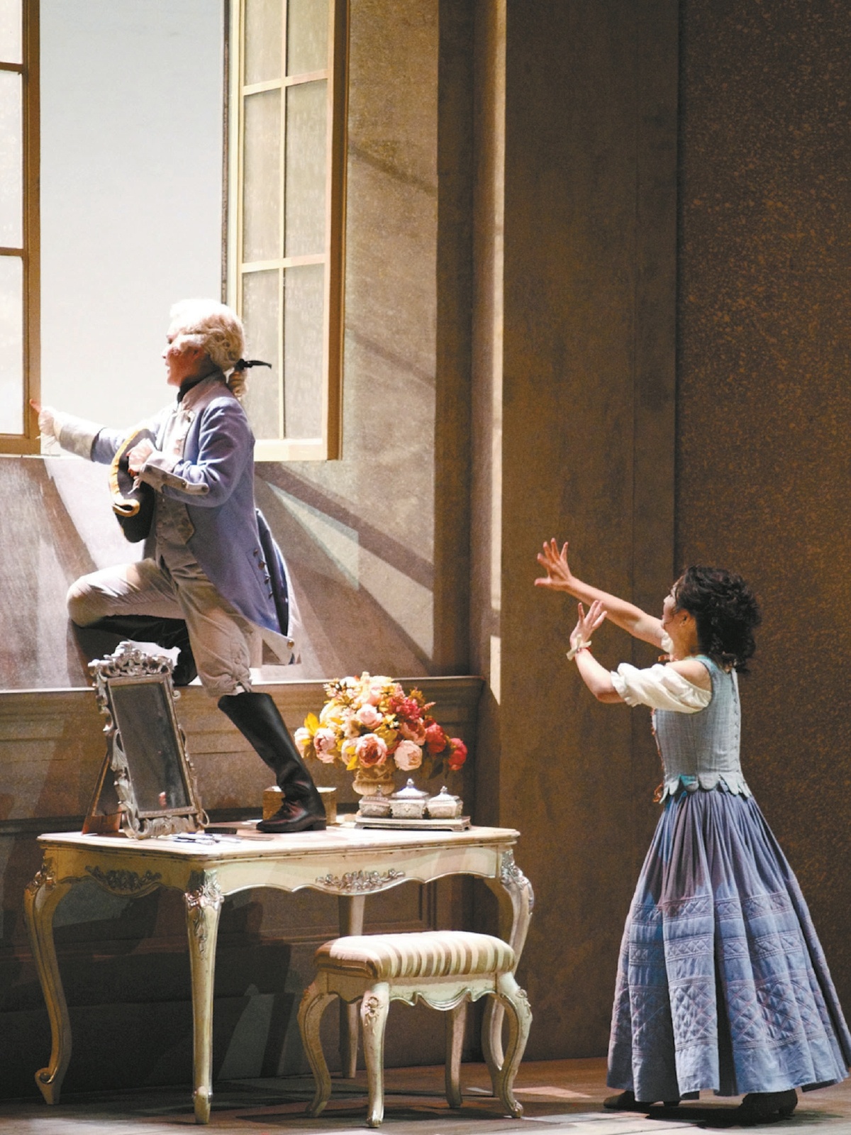 奧地利男中音馬庫斯·維爾巴飾演的費加羅一登場便贏得滿堂喝彩。他以渾厚圓潤的音色與精湛的表演技巧,將這位機智勇敢的男仆形象刻畫得入木三分。在詠嘆調“如果你想跳舞”中,維爾巴與國家大劇院合唱團的默契配合將劇情推向首個高潮,合唱團飽滿和諧的和聲為音樂增添了絢麗色彩。第一幕結尾處,維爾巴演唱的著名詠嘆調“再不要去做情郎”以明快有力的旋律與溫柔勸導的宣敘調交替呈現,生動展現了費加羅幽默風趣與堅定勇敢的雙重性格,鏗鏘有力的演唱贏得全場掌聲雷動。