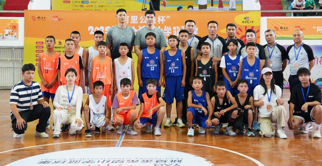 新疆男籃球員阿不都沙拉木(后排左四)、朱旭航(后排左三)與小球員們合影留念。新華社記者 阿曼 攝