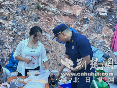 圣境山夜市依托近郊山體優勢,以特色小吃、文創市集和親子游樂為亮點,商戶多為臨時搭建的棚亭或移動餐車,夏季用火用電集中,加之人流密集,消防安全隱患不容忽視。針對這一特點,消防宣傳人員首先穿梭在餐飲攤位間,重點排查燃氣使用隱患。