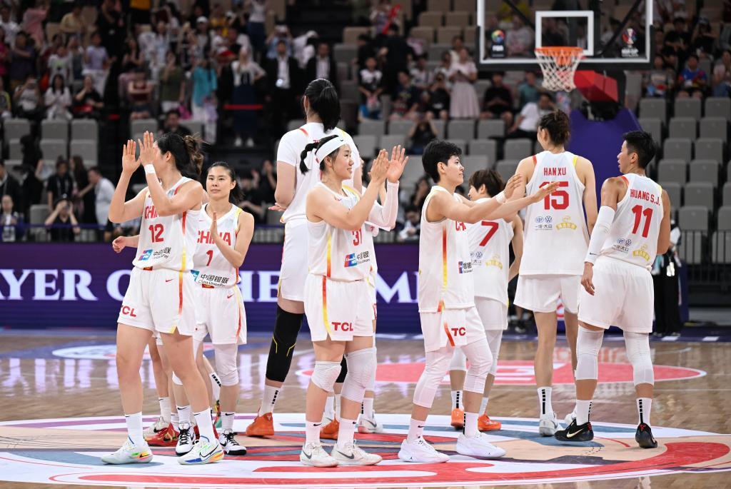 7月16日,在深圳舉行的2025國際籃聯女籃亞洲杯小組賽后,中國隊球員慶祝勝利。新華社記者 鄧華 攝