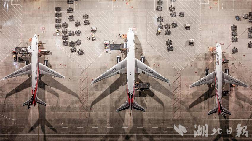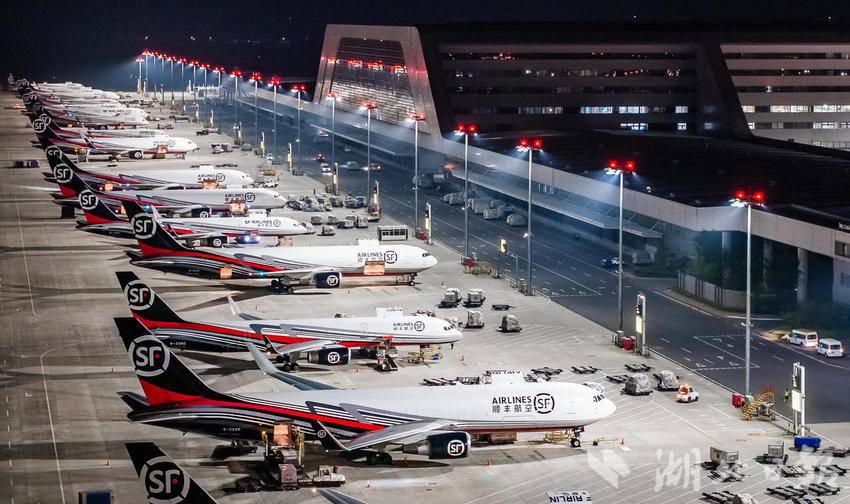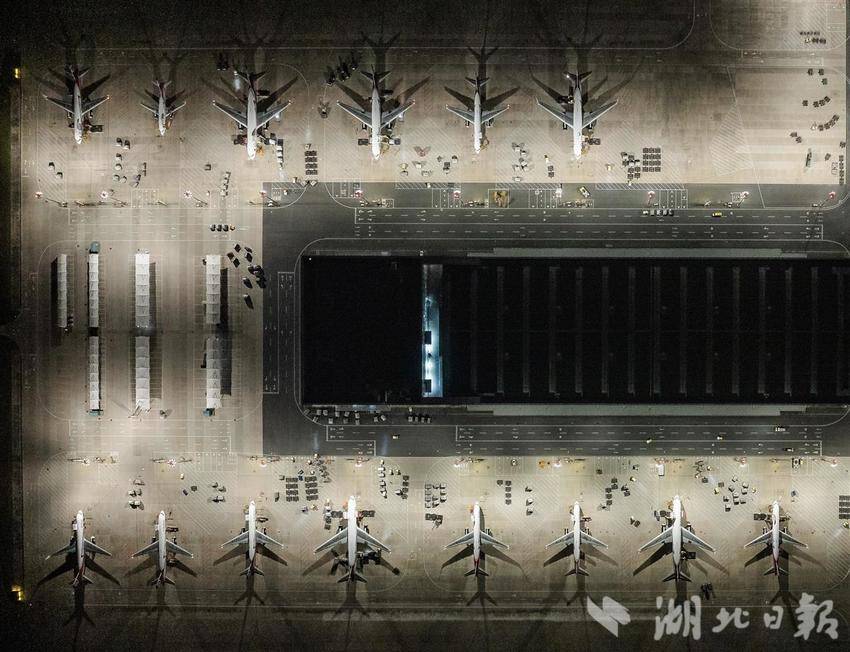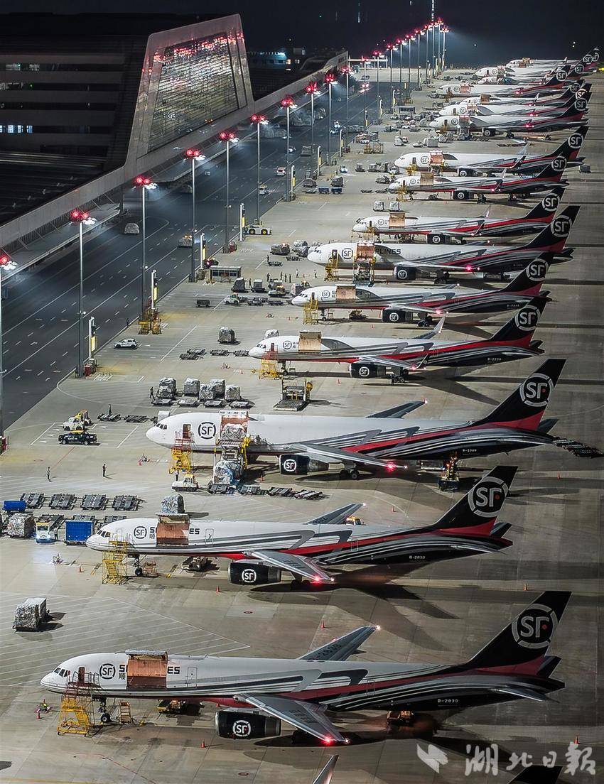 7月11日凌晨3時30分許,鄂州花湖國際機場停機坪一片繁忙,幾十架貨機依次排列,構成壯觀的“飛機雁陣”。