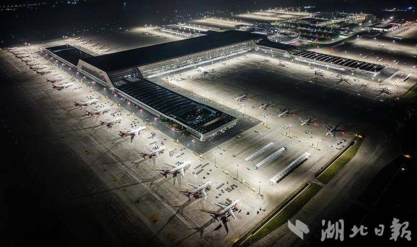 7月11日凌晨,鄂州花湖國際機場燈火通明,幾十余架貨機依次排列在停機坪上。