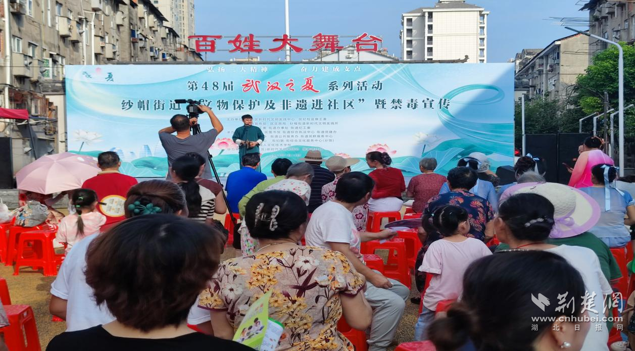 文化惠民活動,第48屆武漢之夏主題系列活動走進廖家堡社區“百姓大舞臺”。紅色文藝輕騎兵自編自演的節目獲居民陣陣掌聲,新創作的湖北大鼓《紗帽山記引發共鳴,讓大家從歷史人文故事中了解“紗帽山”由來,感受禹青投冠治水的為民情懷。非遺文化展示區里,居民可免費品嘗大嘴魚丸、養心潤肺湯等非遺美食,領取糖畫、泥人面塑等作品,在夏日體驗別樣快樂。