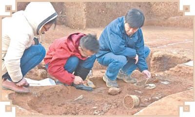 武漢大學教授張昌平(右一)帶領隊員在進行考古發掘。