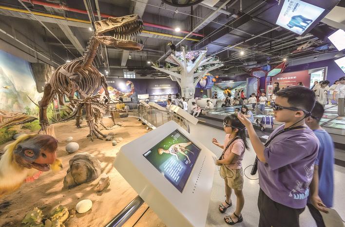 7月17日,武漢科技館游客絡繹不絕。暑假期間,許多家長帶著孩子來此參觀,通過虛擬現實設備,小朋友可以穿越到侏羅紀世界與恐龍親密接觸,或伸手喚醒展示的生物模型,沉浸式的科普體驗讓孩子們流連忘返。楚天都市報極目新聞記者李輝 通訊員譚琛攝
