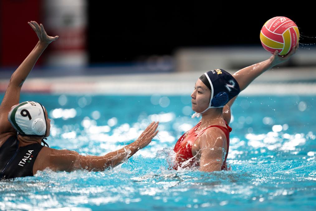中國隊在交叉賽中遭遇世界排名第七的意大利隊,雙方一開場就開始在水中“肉搏”,比拼防守。第一節中國隊以0:2落后。次節中國隊逐漸找到進攻節奏,由王詩蘊率先破門,此后雙方你來我往,交替得分。張育綿、周尚、張玘鑠的進球幫助中國隊緊咬比分,半場結束中國隊5:6落后。