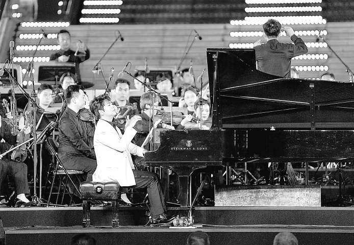 當全體觀眾沉浸在抗戰英雄的回憶中時,北京的天使童聲合唱團與香港兒童代表攜手演繹經典抗戰合唱曲目《保衛黃河》,百人的陣容唱出兩地青少年同心共筑民族記憶的信念。緊接著,著名鋼琴家郎朗與青年盲人鋼琴家劉浩先后登臺,分別演繹鋼琴協奏曲《黃河》的不同樂章。
