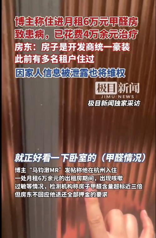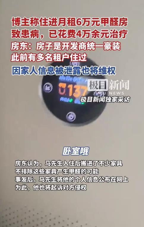 近日,博主“馬鈞澈MR”(本姓馬)發(fā)帖稱,他在杭州入住一處月租6萬余元的租房期間,出現(xiàn)咳嗽、過敏等身體異常情況,檢測機(jī)構(gòu)的結(jié)果顯示房子甲醛含量超標(biāo)近三倍,但房東不回應(yīng)他退還全部押金的要求。7月17日,極目新聞?dòng)浾呗?lián)系到房東程先生,他表示,馬先生入住的房子交房已有5年,之前有其他房客入住過。馬先生入住后搬進(jìn)了不少家具,不排除這些家具產(chǎn)生甲醛的可能。如果馬先生對退租有異議,可以通過法律途徑解決。馬先生將他及家人的信息公布在網(wǎng)絡(luò)上,他也將采取措施維護(hù)權(quán)益。
