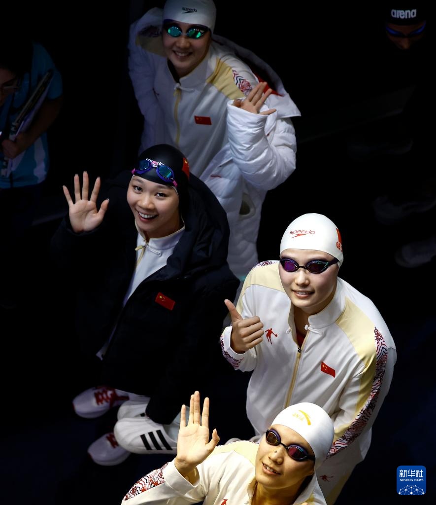 7月17日,中國隊第一棒選手劉姝含(左)和第二棒選手葛楚彤鼓勵隊友。新華社記者 杜哲宇 攝