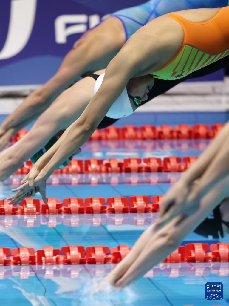 7月17日,中國隊第一棒選手劉姝含在比賽中入水。新華社記者 杜哲宇 攝