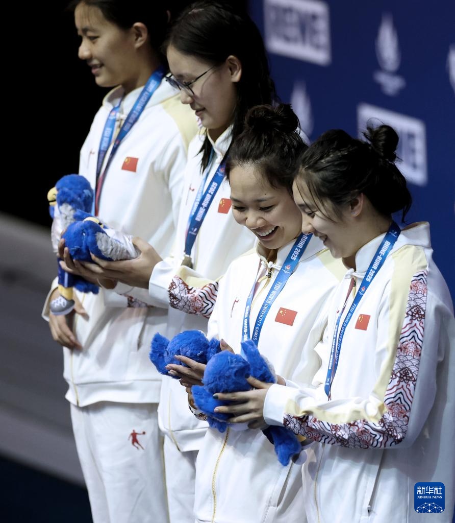 7月17日,劉姝含、葛楚彤、俞李妍、艾衍含(左至右)在頒獎儀式上。新華社記者 杜哲宇 攝