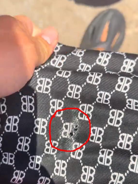 視頻顯示,多名顧客頂著太陽坐在一餐館門口,桌子和凳子都是金屬材質的,凳子還是凹面形狀,并且有反光。一名顧客展示,他褲子上出現(xiàn)了一個小洞,該顧客還拿起一張紙巾放在凳子上方約20厘米處,沒過多久紙巾就自燃了。