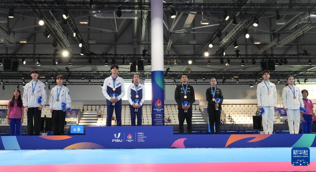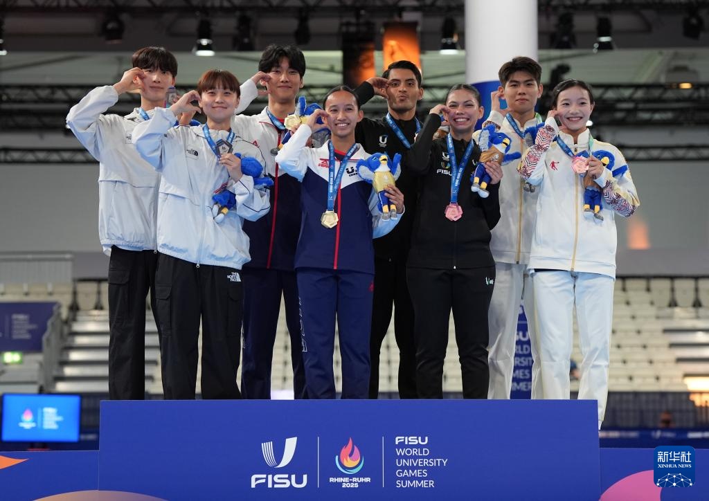 當日,2025年萊茵-魯爾世界大學生夏季運動會跆拳道混合雙人品勢決賽在德國埃森舉行。
