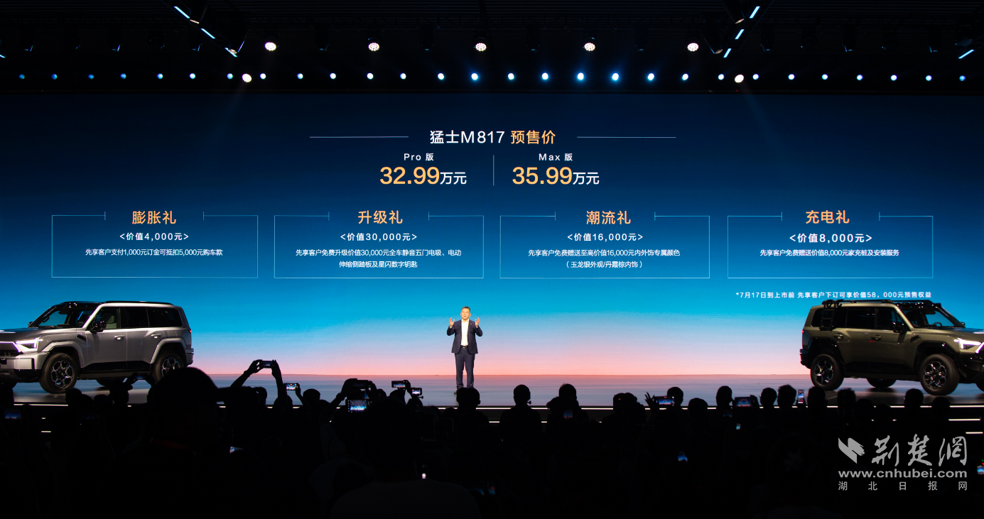荊楚網(湖北日報網)訊(記者陳泉 通訊員張雋 攝影孫曉飛 )7月17日,猛士M817技術發布暨新車預售活動舉行。東風猛士與華為聯手發布“全域通達、全維安全、全棧華為”三大硬核技術集群。當天,猛士M817開啟預售,預售價32.99萬元起,預售1小時,訂單9713臺。