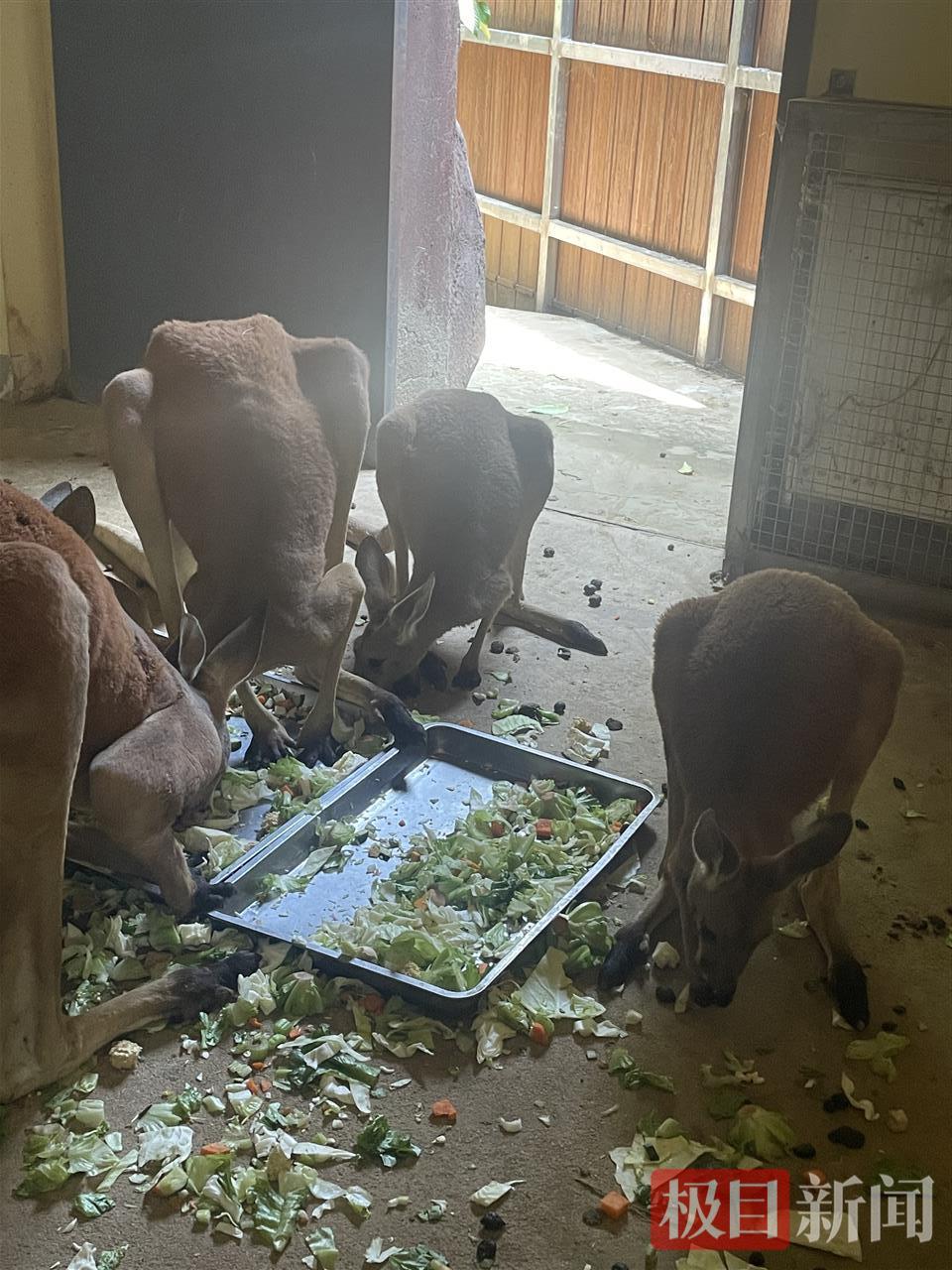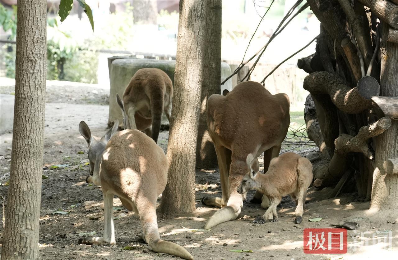 赤大袋鼠是世界上目前現存的最大袋鼠。赤大袋鼠外活動場,一個小分隊在樹蔭下聚會。而走進赤大袋鼠的內室,清涼的風撲面而來,兩臺空調上顯示的氣溫是25℃,有一扇通往外活動場的門敞開著,好幾只赤大袋鼠正在室內共享蔬果沙拉,“有生菜,南瓜,包菜,胡蘿卜,雞蛋,玉米……”保育員張熙說,門開著,讓它們自由進出,想出去隨時可以出去,覺得熱了,也可以隨時進來,赤大袋鼠不是特別怕熱,但午間高溫熱浪會有點吃不消,安裝空調也是希望它們在夏季的每個日夜都過得舒適。