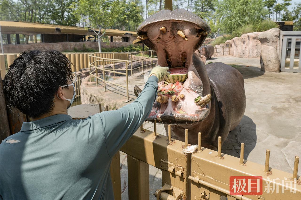 武漢動物園相關人士介紹,時值盛夏,一天更比一天熱,所以給河馬特別安排了食物解暑,每周一、三、五,每頭河馬一個大西瓜。