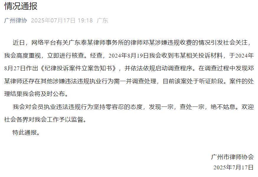 此事在網絡引發關注。7月17日晚,廣州律協發布通報稱,2024年8月19日該會收到韋某相關投訴材料,于2024年8月27日作出《紀律投訴案件立案告知書》,并依法依規啟動調查程序。在調查過程中發現鄧某還存在其他涉嫌違法違規執業行為需一并調查處理,目前該案處于聽證階段。案件的處理結果將會及時公布。