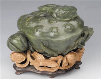 孔子博物館收藏的蓮蓬碧玉盒,以碧玉雕成蓮蓬之形,仿若一個(gè)清甜可口的真蓮蓬就在眼前。盒身紋理則模仿蓮蓬脈絡(luò),精細(xì)入微。倘若能打開盒蓋,怕是能嗅到夏日蓮池的清香吧。古人以玉為盒,將蓮的潔凈、蓮蓬的多子多福之意,藏于其中,讓溫潤(rùn)美玉承載著對(duì)生活的美好期許。