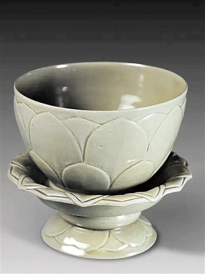 蘇州博物館收藏的五代越窯秘色瓷蓮花碗,是該館的三件國(guó)寶文物之一,由碗與盞托組成,堪稱瓷中珍品。其造型如盛開蓮花,高雅出塵。碗身外壁、盞托盤面和圈足,皆飾重瓣蓮花,如浮雕般凸起,釉色晶瑩潤(rùn)潔,讓人仿佛看到古時(shí)匠人,正凝神靜氣,以瓷為箋,繪蓮之姿。于是,千年前的荷香,便透過(guò)這溫潤(rùn)器物,悠悠飄至眼前。