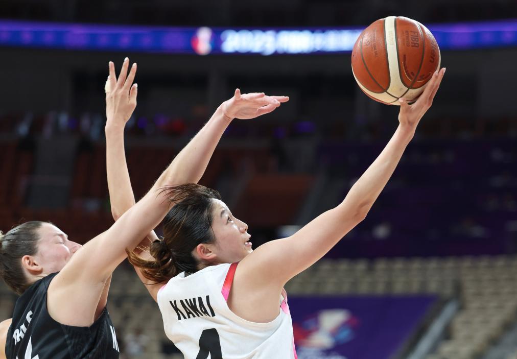 7月18日,日本隊球員川井麻衣(右)在比賽中上籃。新華社記者 盧漢欣 攝