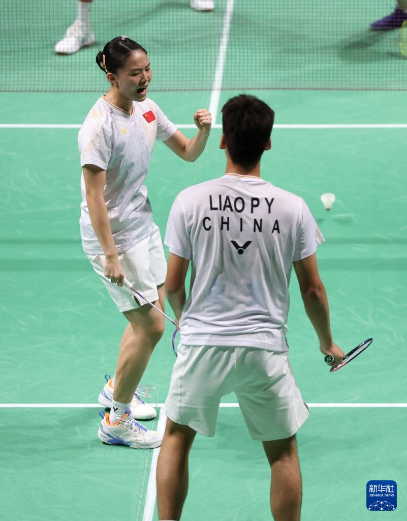 7月18日,中國隊組合廖品逸/李茜(左)在混雙比賽中慶祝得分。新華社記者 胡星宇 攝