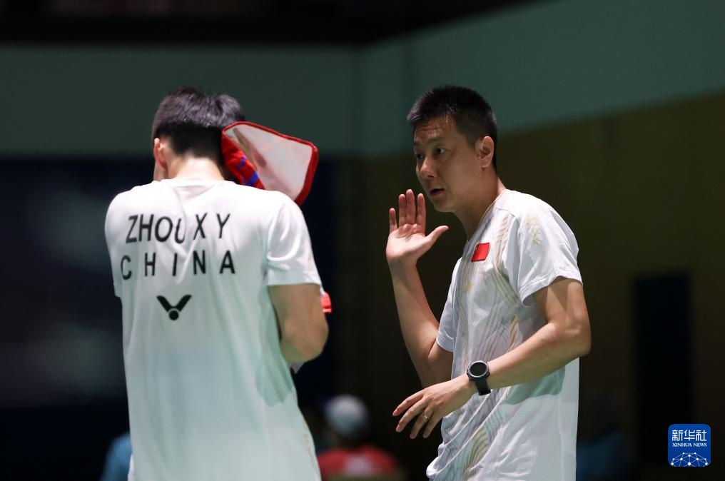 7月18日,中國隊教練陳金(右)在比賽間隙指導中國隊選手周新宇。新華社記者 胡星宇 攝