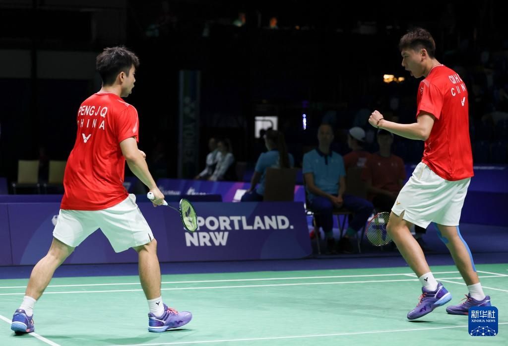 7月18日,中國(guó)隊(duì)組合崔赫宸(右)/彭建欽在男雙比賽中慶祝得分。新華社記者 胡星宇 攝