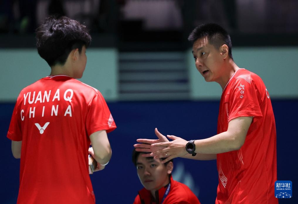 7月18日,中國(guó)隊(duì)教練高崚(右二)和劉仲(右一)在女雙比賽間隙指導(dǎo)劉嘉悅(左二)/唐睿芝。新華社記者 胡星宇 攝
