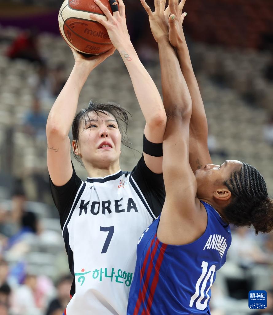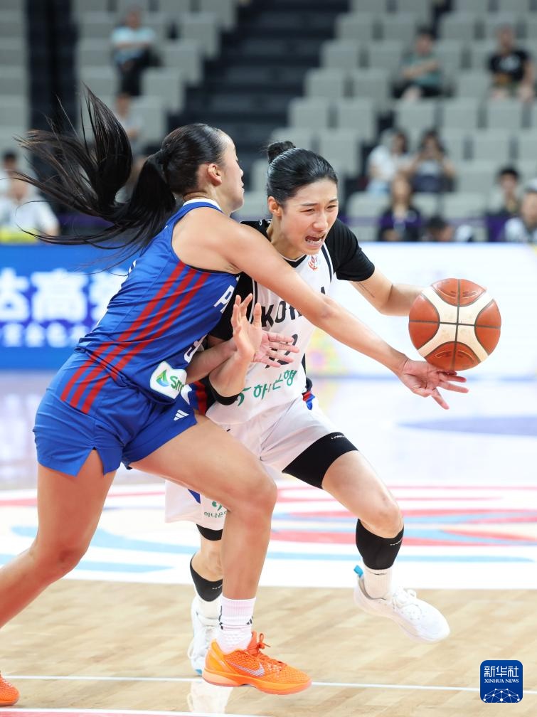 7月18日,韓國隊球員樸智秀(左)在比賽中投籃。新華社記者 盧漢欣 攝