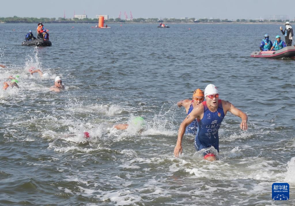 7月19日,中國公安體育協會鐵人三項隊選手李明旭(右一)在男子優秀組游泳比賽中。最終,他以56分52秒的成績獲得第二名。新華社記者 楊世堯 攝