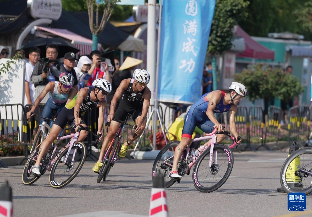 7月19日,廣東鐵人三項隊選手黃立科在男子優秀組自行車比賽中。最終,他以57分09秒的成績獲得第三名。新華社記者 楊世堯 攝