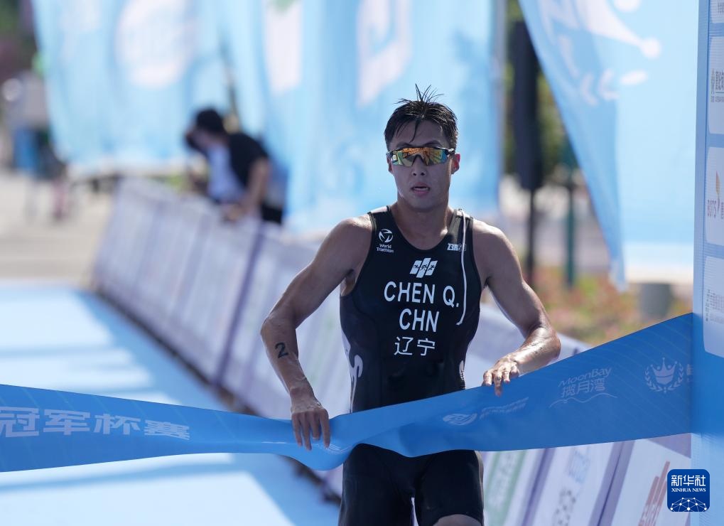 7月19日,遼寧鐵人三項隊選手陳綮在男子優秀組跑步比賽中沖線。最終,他以55分13秒的成績獲得第一名。新華社記者 楊世堯 攝