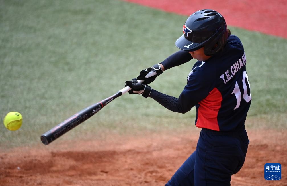 7月19日,中國臺北隊球員姜婷恩在比賽中擊球。新華社記者 李一博 攝