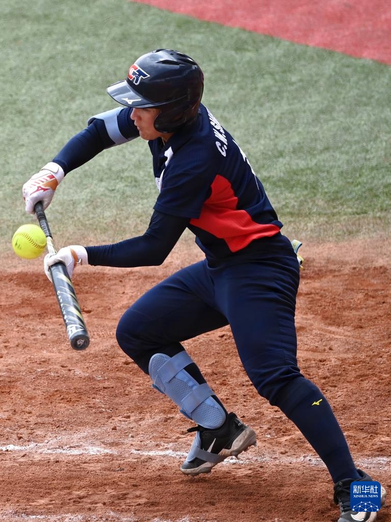 7月19日,中國臺北隊球員沈嘉玟在比賽中擊球。新華社記者 李一博 攝