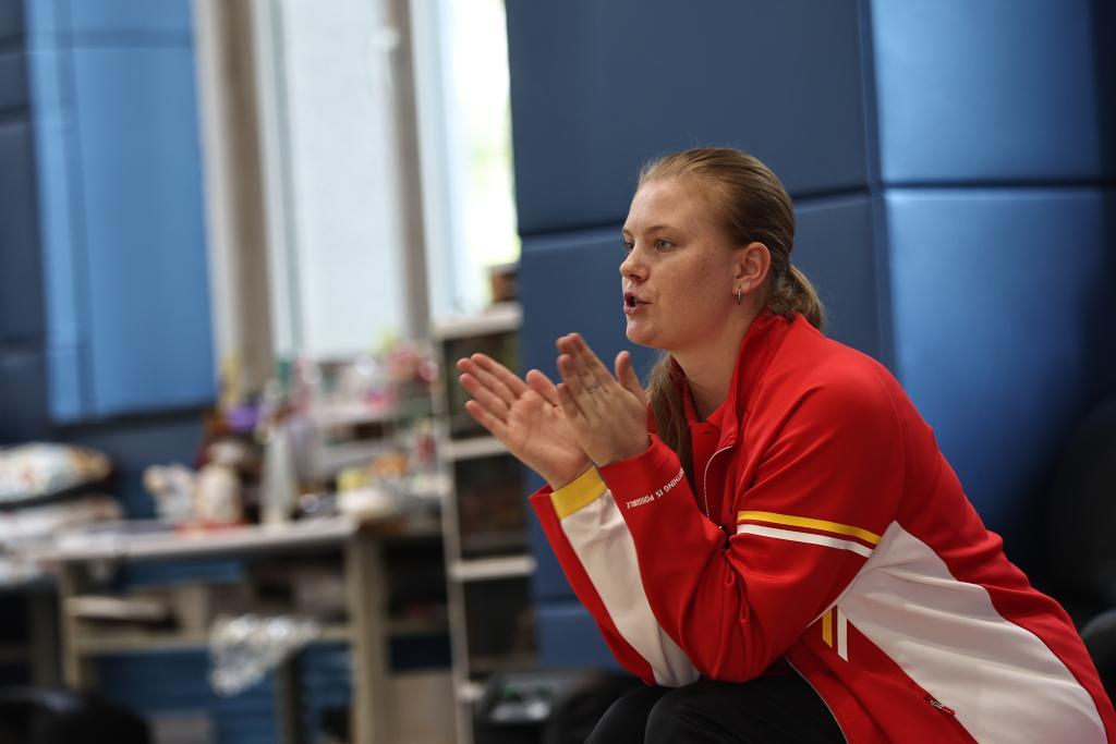 7月18日,漢娜·施瓦鮑爾在訓練中為隊員指導動作。新華社記者 潘昱龍 攝