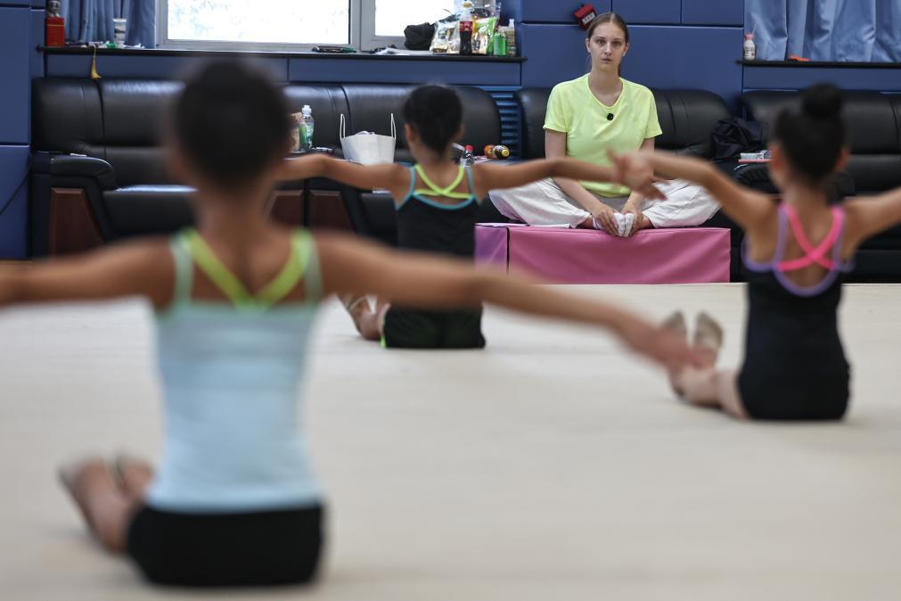 7月18日,遼寧金滿星藝術體操隊成年集體主教練馬千惠(右一)指導隊員訓練。新華社記者 潘昱龍 攝
