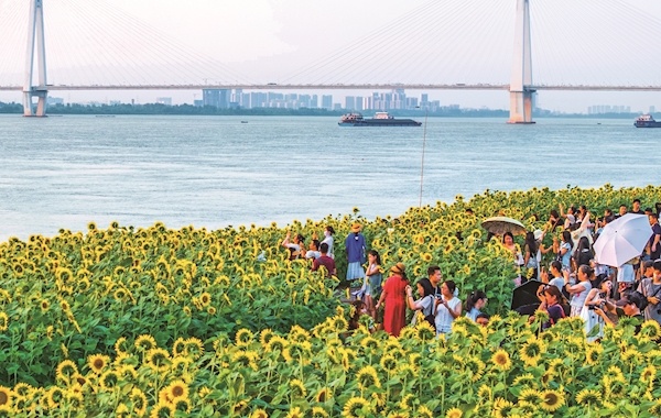 7月18日,武昌江灘鐵機(jī)路段向日葵花海驚艷盛放,2400平方米的金色花海沿著江邊鋪展開(kāi)來(lái),吸引眾多游人打卡。傍晚時(shí)分,長(zhǎng)江、夕陽(yáng)、向日葵、白塔互相映襯,勾勒出一幅浪漫的夏日畫卷。楚天都市報(bào)極目新聞?dòng)浾哐︽脭z影報(bào)道