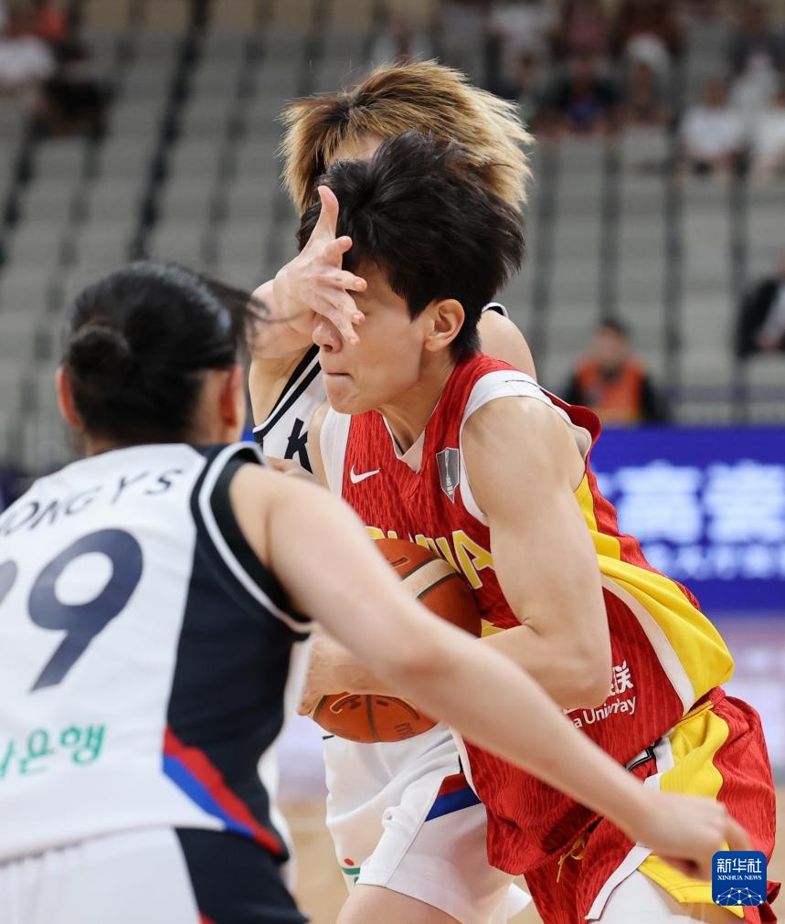 7月20日,中國隊球員韓旭(右)在比賽中防守韓國隊球員樸智秀的投籃。
