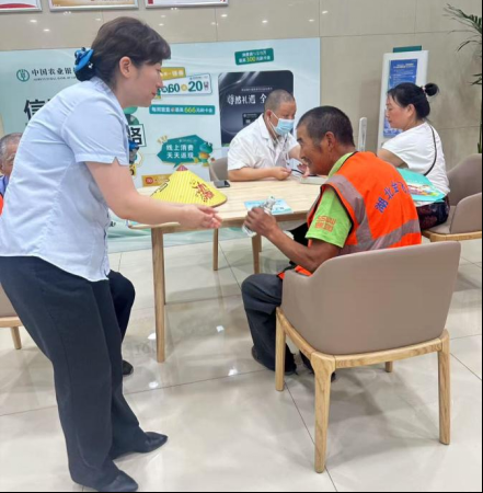 銀行網點的“農情暖域”專區煥然一新。工作人員精心準備了礦泉水、風油精、驅蚊水、創口貼等防暑降溫物品,為高溫下的戶外工作者提供清涼呵護。部分網點還邀請了社區醫院醫生為群眾免費量血壓、測心率,提供醫療咨詢。
