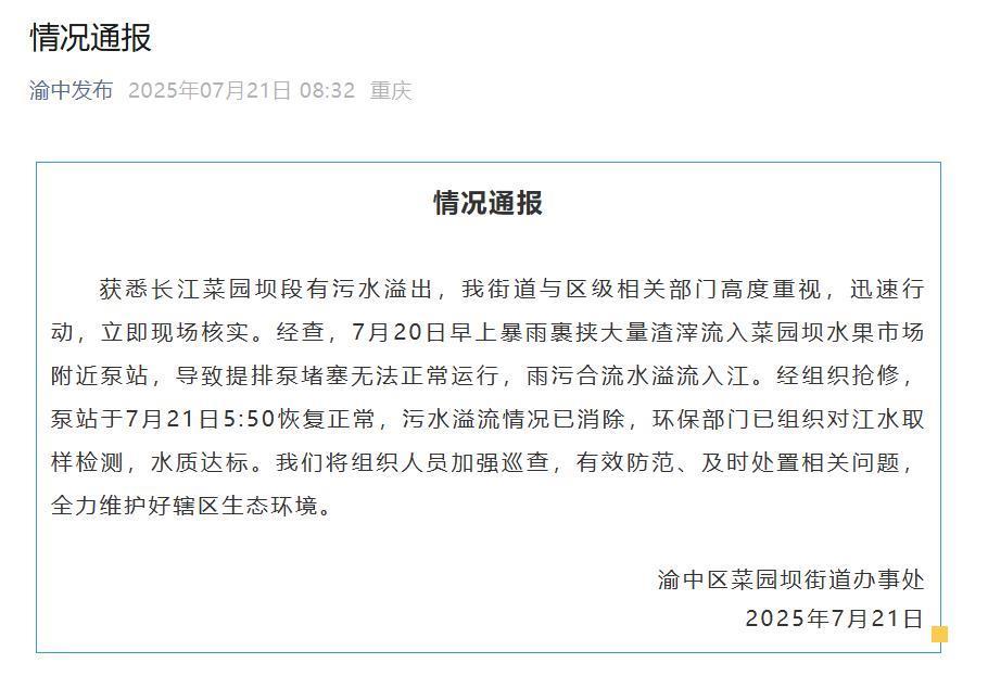 經組織搶修,泵站于7月21日5時50分恢復正常,污水溢流情況已消除,環保部門已組織對江水取樣檢測,水質達標。我們將組織人員加強巡查,有效防范、及時處置相關問題,全力維護好轄區生態環境。